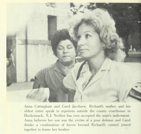‘’My brother didn’t murder anyone,’’ she asserted. Although Carol conceded that Richard was ‘’involved’’ with prostitution, gambling, and loansharking, she stubbornly argues that her brother is the real victim. She even suggested that, because Cottingham brushed with serious criminal activity in New York, the Mafia was ‘’out to get him.’’ She speculated that Richard made enemies with his gambling by using his winnings to freelance as a loan-maker. If it is true he made loans and demanded high interest, or vigorish as the loan sharks call it, Cottingham would not have endeared himself to the underworld. But such small competition could be eliminated much easier and with greater swiftness than the slow, if deliberate, pace of the courts. Nevertheless, Carol Jacobsen believes someone did her brother in. If it wasn’t organized crime and Cottingham’s flirtation with their ire, then it was the people who run the criminal justice system. And her mother, if no one else, agrees. ‘’It’s the biggest farce I’ve ever seen,’’ Anna Cottingham tearfully declared on June 11, 1981, the day her son was convicted.