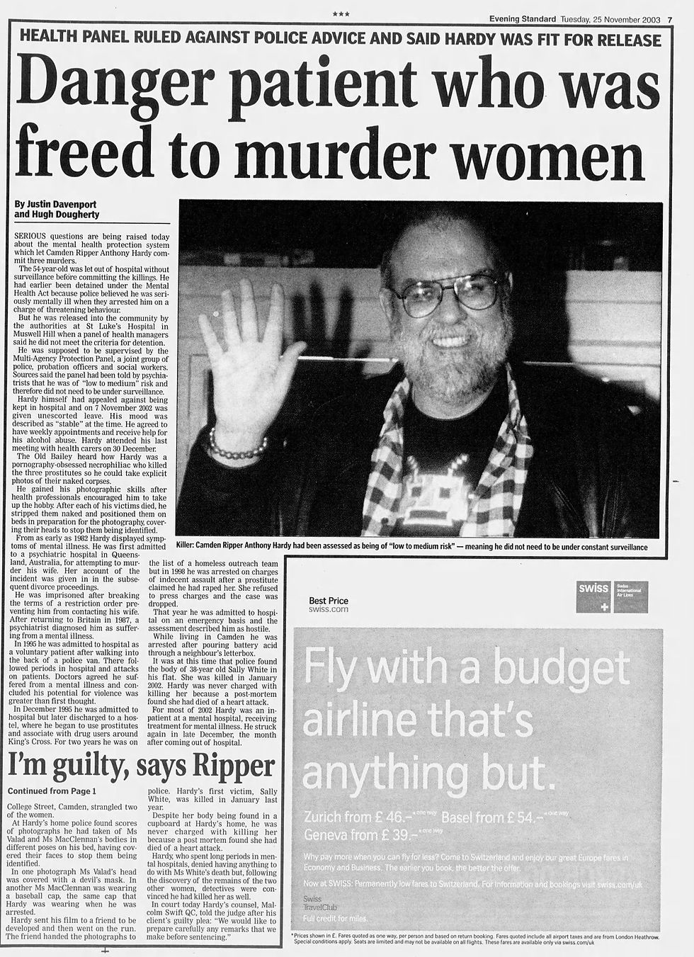 Shortly after Christmas 2002 she met Hardy in King's Cross. Nothing more was to be seen of her until a tramp discovered parts of a woman's legs in a black bin liner in a wheelie bin in Royal College Street on Dec 30. Her torso was later found in Hardy's flat.